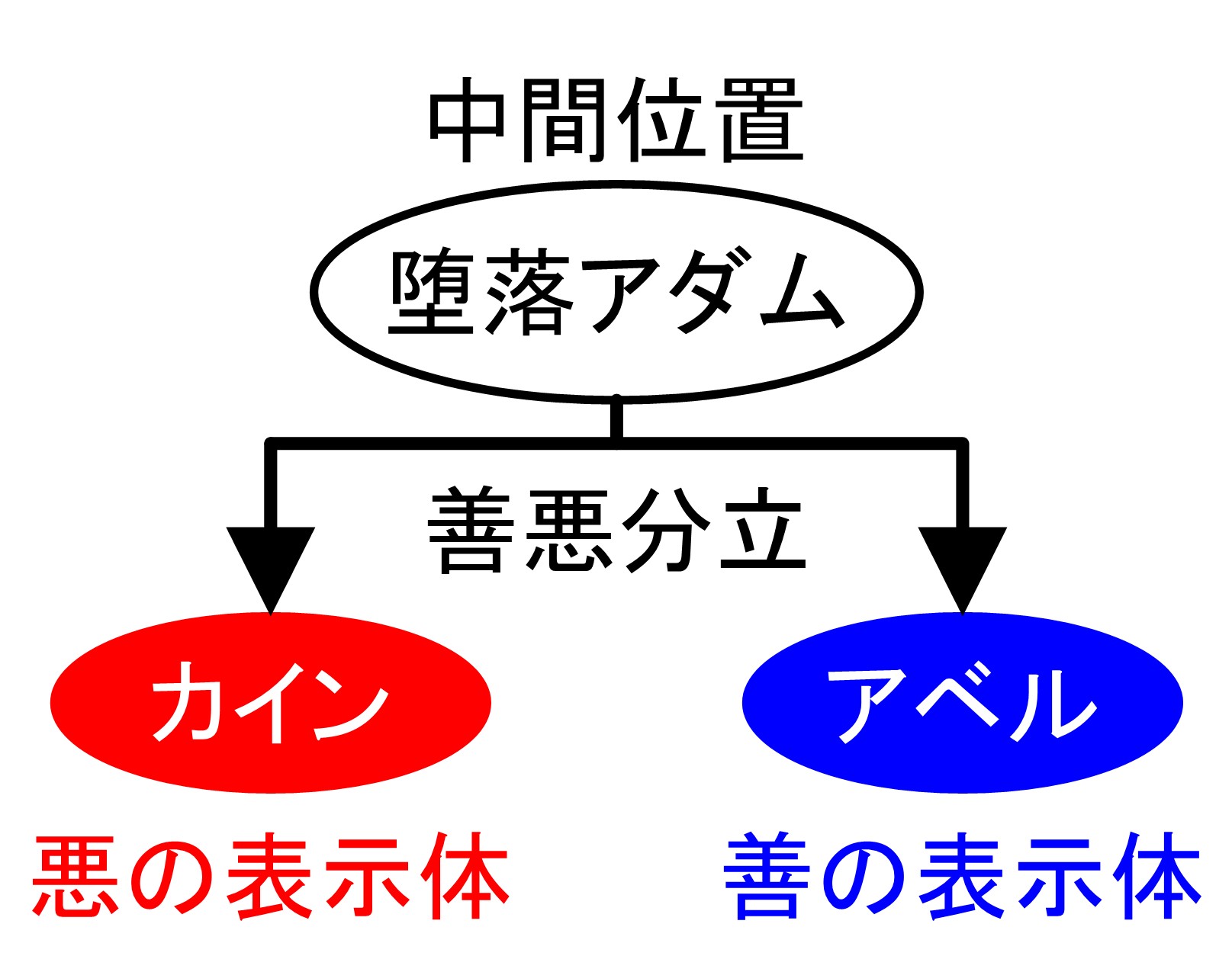 ところで、カインとアベルは、どちらもエバの不倫の愛の実である。したがって、エバを中心として結んだ二つの型の不倫な愛の行為を条件として、それぞれの立場を二個体に分けもたすべくカインとアベルを、各々異なる二つの表示的立場に立てるよりほかに摂理のしようがなかったのである。すなわち、カインは愛の初めの実であるので、その最初のつまずきであった天使長との愛による堕落行為を表徴する悪の表示体として、サタンと相対する立場に立てられたのであり、アベルは愛の二番目の実であるがゆえに、その二番目の過ちであったアダムとの愛による堕落行為を表徴する善の表示体として、神と対応することができる立場に立てられたのである。(『原理講論』p291〜p292)