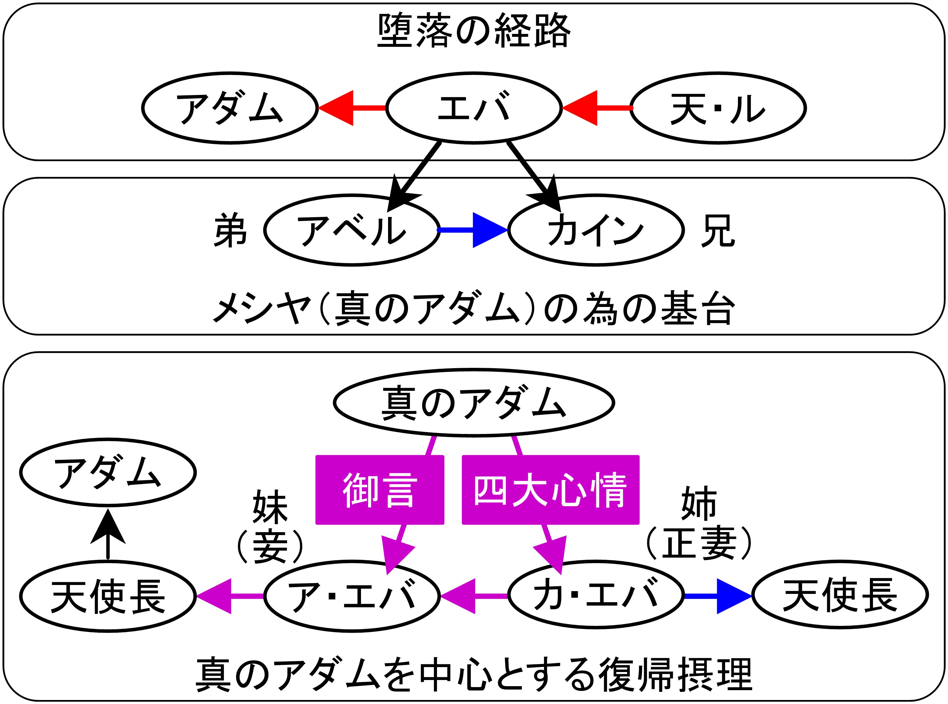 この正妻と妾の立場に立つ二人の女性が、文先生の相対としての基準を立てれば、姉と妹という姉妹関係によって一体となれば、妹は姉より四大心情圏による四大愛によって天使長の立場にある夫を真のアダムとして再創造するとされるのが文先生が語られた再創造摂理である(図3)。残念ながら、この内容は『原理講論』には記されていない(「四大心情圏と良心」参照)。