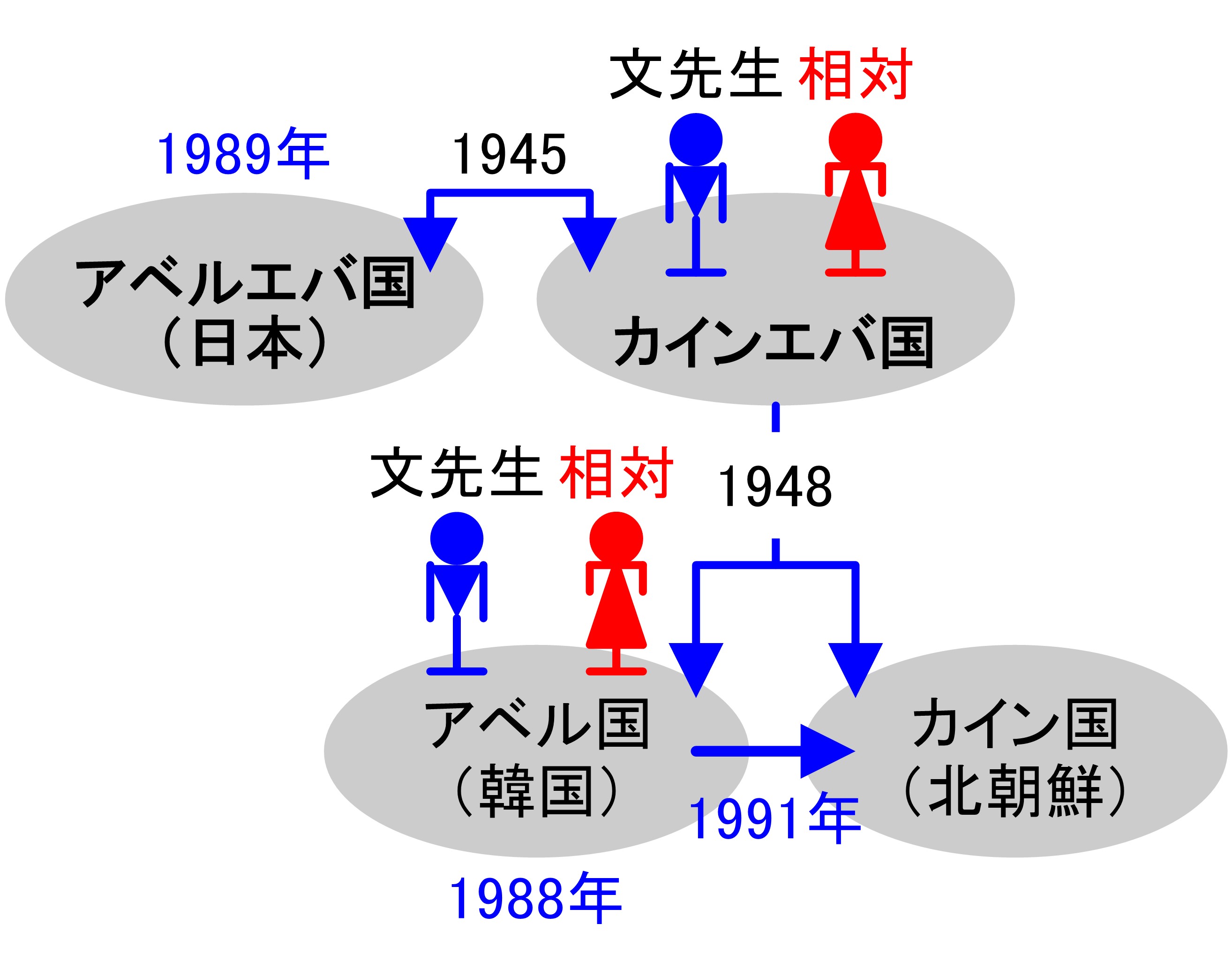北朝鮮と韓国が「統一国」すれば、その「統一国」こそ “アダム国” であると主張するのは間違いである。その「統一国」とは、朝鮮が正妻国としての蕩減復帰の時代を終えたならば、日本の妾国を “妹国” として迎えて、朝鮮が “姉国” となって “姉妹一体となった「エバ国家」” を確立することによって、朝鮮が “真のアダム” の “真の相対国家” に立つことができる国となることを言うのである。