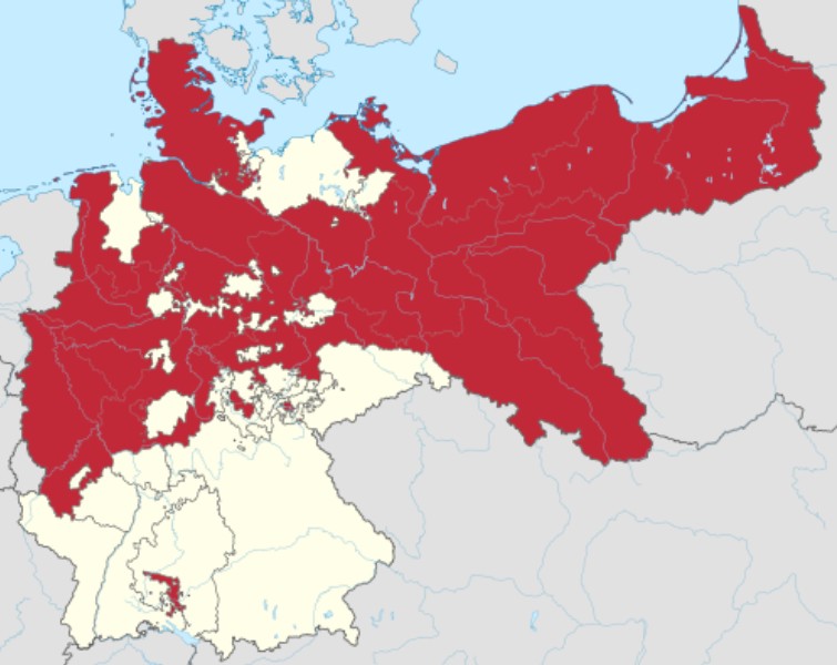 ところで、明治憲法では幕府時代以来の軍事態勢変革のためドイツ統一(ドイツ帝国)の中核となったプロイセン王国(右図)から学び、強国になるための軍事力を発展するよう山縣有朋の指導の下で軍事体制改革を実施した。明治憲法では、「天皇は陸海軍を統帥す」、「天皇は陸海軍の編成及び常備兵額を定む」と規定されていた。