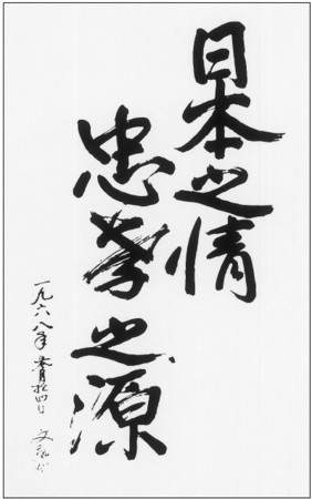 また文先生は、1968年に「日本の情 忠孝の源」(左図)と揮毫され、この言葉には “日本の伝統的な情愛や道徳観(情)が、国や親に対する忠義・孝行(忠孝)の根本となるものである” という意味が込められている。